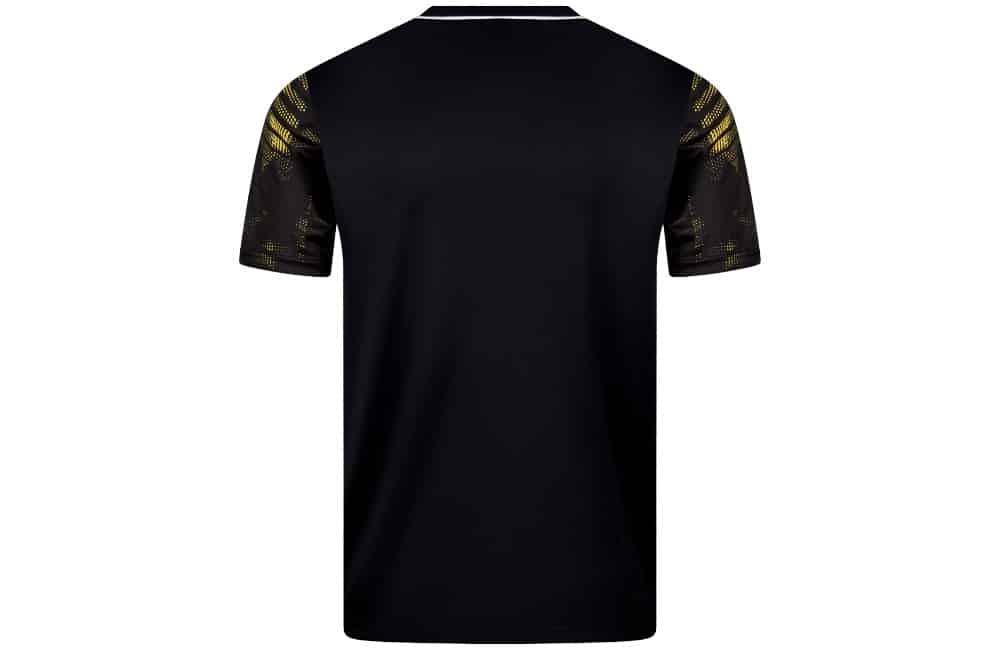 Het shirt heeft een stoere zwarte basiskleur, afgewerkt met een subtiel maar krachtig goud patroon dat elegantie en energie uitstraalt. Dankzij het lichte en ademende materiaal blijf je droog en gefocust, zelfs tijdens de meest intensieve rallies. De moderne pasvorm en V-hals zorgen voor een comfortabele fit met optimale bewegingsvrijheid.